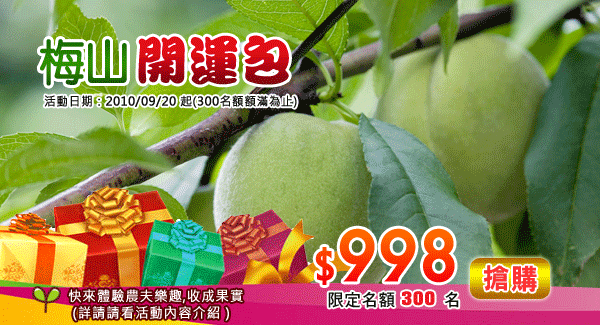 好禮一•998元購買"梅山開運包"-享有梅山當地價值500元特色熱門商品(如:梅製品、茶葉、苦茶油、蛋捲…等),